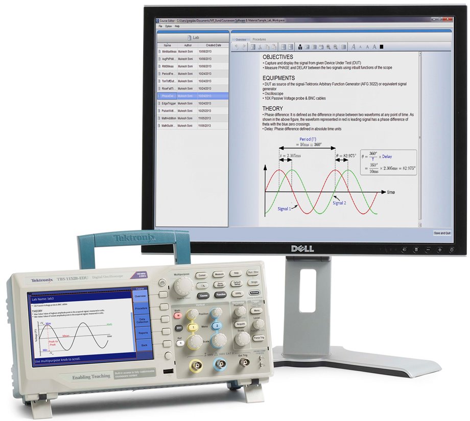 Tektronix ha inoltre sviluppato una biblioteca di contenuti didattici, personalizzabili tramite un software di edizione basato su PC e da un sito web dedicato, dal quale possono essere scaricati gratuitamente una serie di corsi pre-confezionati che prevedono l'utilizzo di un oscilloscopio TBS1000B-EDU.