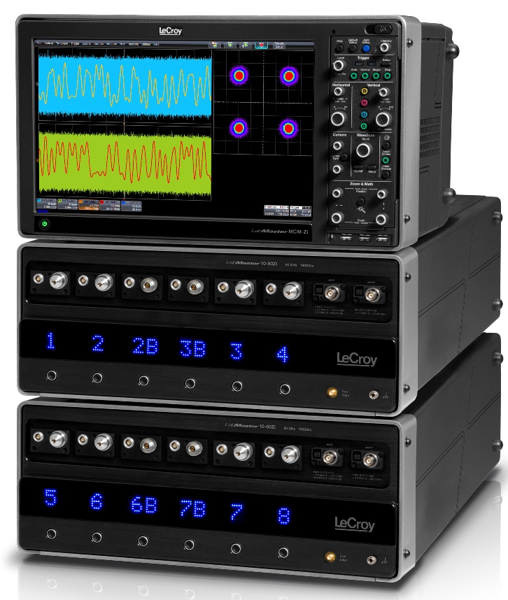 Inoltre, l'architettura di sincronizzazione ad alta velocità tra vari moduli di acquisizione, che LeCroy chiama ChannelSync, consente di realizzare sistemi multicanale molto veloci con una densità senza precedenti, per esempio fino a ben 10 canali da 60 GHz e 160 Gs/s oppure 20 canali da 36 GHz a 80 Gs/s.