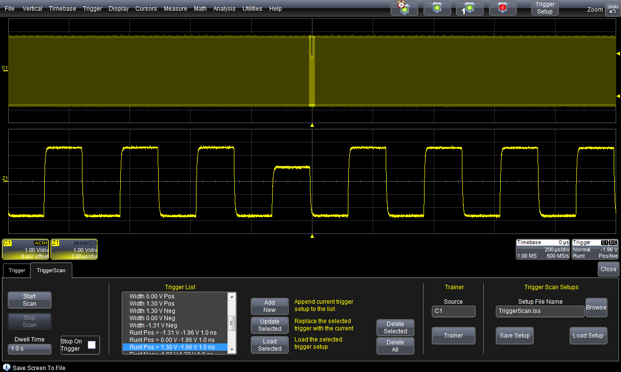 Le funzione TriggerScan è in grado di individuare e catturare più anomalie al secondo rispetto a semplici modalità di visualizzazione veloce, utilizzando un circuito hardware dedicato al trigger per individuare andamenti del segnale indesiderati, onde poi acquisirli e visualizzarli in modalità con persistenza infinita così da consentire ulteriori analisi od azioni.