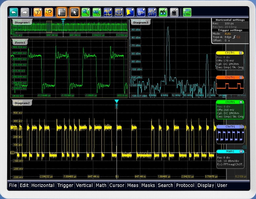 Non dovendo garantire alcuna compatibilità o abitudine con il passato, i progettisti di Rohde & Schwarz hanno avuto la possibilità di avere “carta bianca” per definire l’interfaccia utente di questa nuova serie di oscilloscopio e il risultato è stupefacente.
