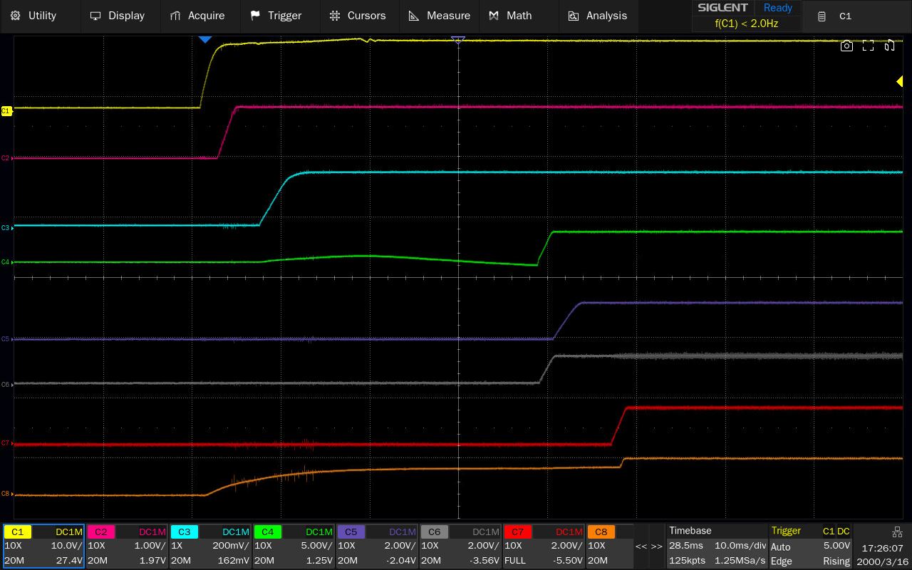L'oscilloscopio SDS5000X HD acquisisce l'intero processo di accensione di tutti i segnali rilevanti in un'unica acquisizioneUna delle applicazioni dei nuovi oscilloscopi è il test della sequenza di accensione nei sistemi embedded.