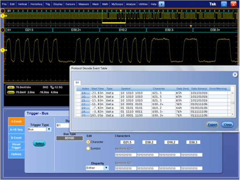 Ad esempio, per facilitare le analisi sui bus seriali ad altissima velocità basati sugli standard più recenti è stata prevista la decodifica del codice di linea seriale 8b/10b. Le funzionalità di decodifica del bus velocizzano il debug e la validazione dei progetti basati su questi standard di comunicazione legando le informazioni elettriche del livello fisico con quelle di protocollo del livello logico. Le funzioni di trigger e di ricerca sui dati acquisiti possono così agire anche sulle informazioni di protocollo e visualizzare contemporeamente la forma d'onda nel dominio del tempo con la sua interpretazione a livello di protocollo.