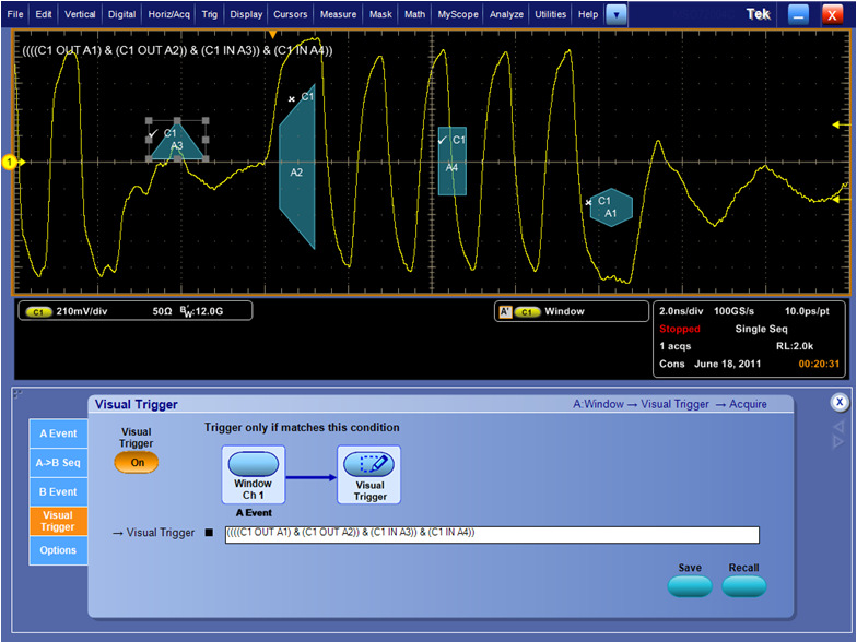 Un'altra novità è il trigger visivo (Visual Trigger). In sostanza, è possibile disegnare sullo schermo fino a 8 aree di rispetto entro le quali non dovrebbe mai passare il segnale per essere considerato corretto. Il trigger visuale può essere abbinato ad altre condizioni per ricercare quegli eventi che con le modalità classiche sarebbero difficili da identificare rapidamente, ad esempio per trovare errori nei protocolli di comunicazione con le memorie DDR o altri bus che utilizzano schemi di interfacciamento particolari.