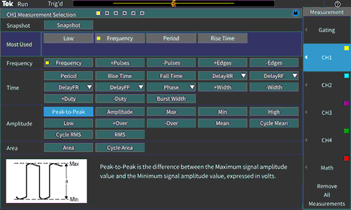 Lettura dei valori direttamente con cursori “On-waveform” e funzionalità cosiddetta di “search and mark”. Garantisce l’immediata identificazione e visualizzazione di eventi specifici sulla forma d’onda acquisita
