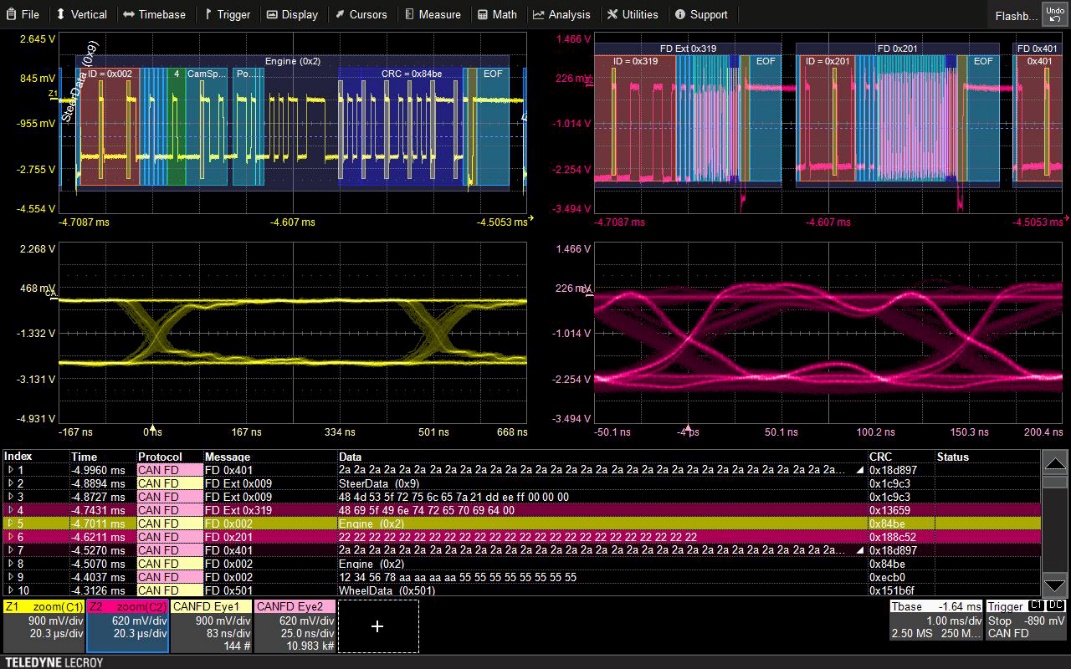 Inoltre, i pacchetti TDME (Trigger, Decode, Measure and Eye diagram) completano i pacchetti TD, consentendo l'estrazione dei dati decodificati e dei successivi diagrammi della forma d'onda, l'esecuzione di misure di temporizzazione del bus e la creazione di diagrammi ad occhio per i test su maschere standard o personalizzate.