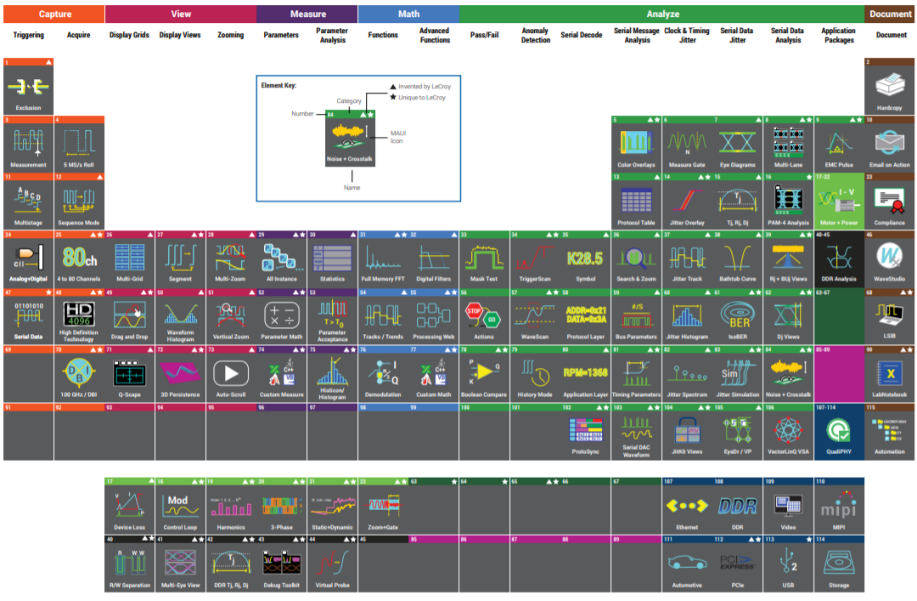 Tavola periodica degli strumenti dell'oscilloscopio: Gli oscilloscopi WaveRunner 9000 hanno la massima ampiezza e profondità di strumenti, garantendo una rapida risoluzione delle operazioni di debug più complesse. La tavola periodica degli strumenti per oscilloscopi fornisce un quadro di riferimento per comprendere i set di strumenti che Teledyne LeCroy ha creato e distribuito nei suoi oscilloscopi.
