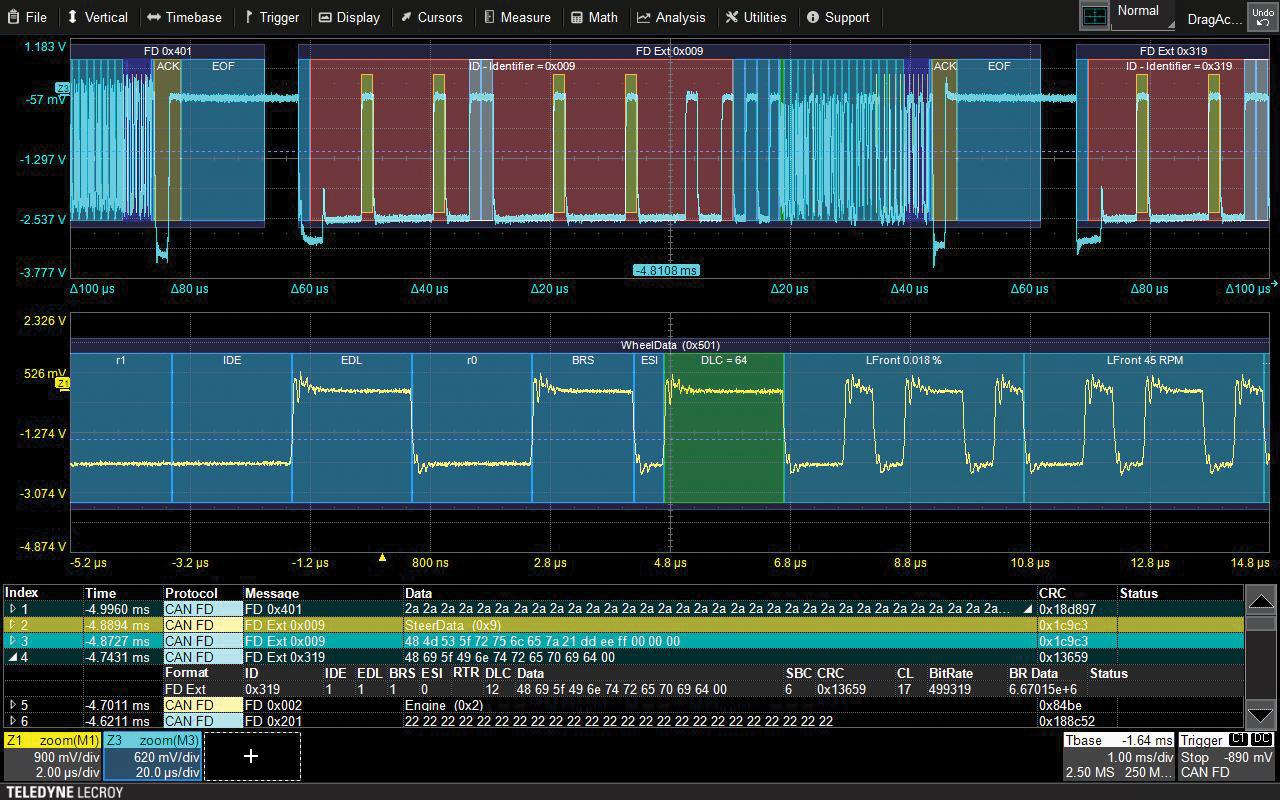 L'ampia selezione di pacchetti di trigger e decodifica dei dati seriali (TD) permette di impostare il trigger sui segnali seriali in modo sofisticato e flessibile, abbinandolo ad un'intuitiva decodifica in chiaro colori sovrapposta alle forme d'onda.