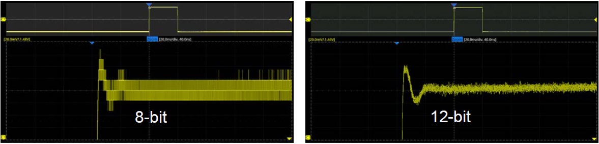 La risoluzione a 8 bit degli oscilloscopi comunemente disponibili sul mercato è spesso insufficiente per registrare questo tipo di dettagli. Uno strumento con conversione analogico-digitale a 12 bit offre una risoluzione 16 volte superiore ed è quindi molto adatto a svolgere questi compiti.