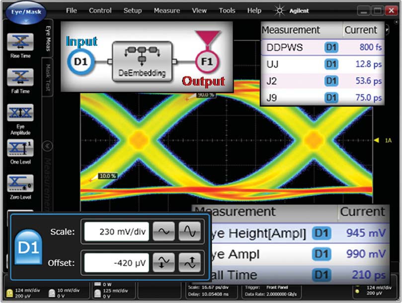 Tra le molte novità inserite nel nuovo modello 86100D DCA-X vi sono l'integrazione con l'opzione InfiniiSim-DCA delle funzioni di stima e rimozione dell'equalizzazione del segnale misurato (embedding e de-embedding) per tenere conto delle differenze tra segnale acquisito alla sonda e segnale visto dall'ingresso reale del ricevitore del dispositivo in prova.