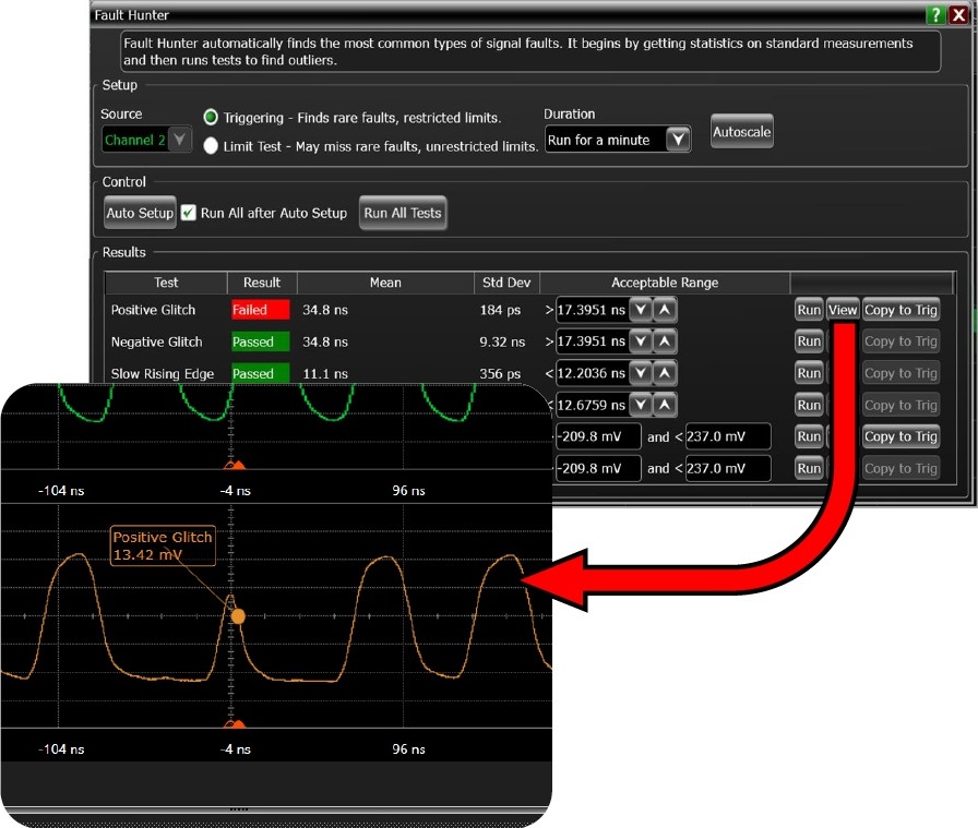 Tra le numerose caratteristiche funzionali condivise con gli analoghi strumenti della famiglia MXR, segnaliamo la disponibilità dell'innovativo "cercaguasti automatico", battezzato da Keysight come fault hunter, una funzione software che va a caccia di anomalie sui segnali anche su sequenze di acquisizione molto lunghe, che può aiutare molto nello attività di debug per scovare problemi intermittenti.