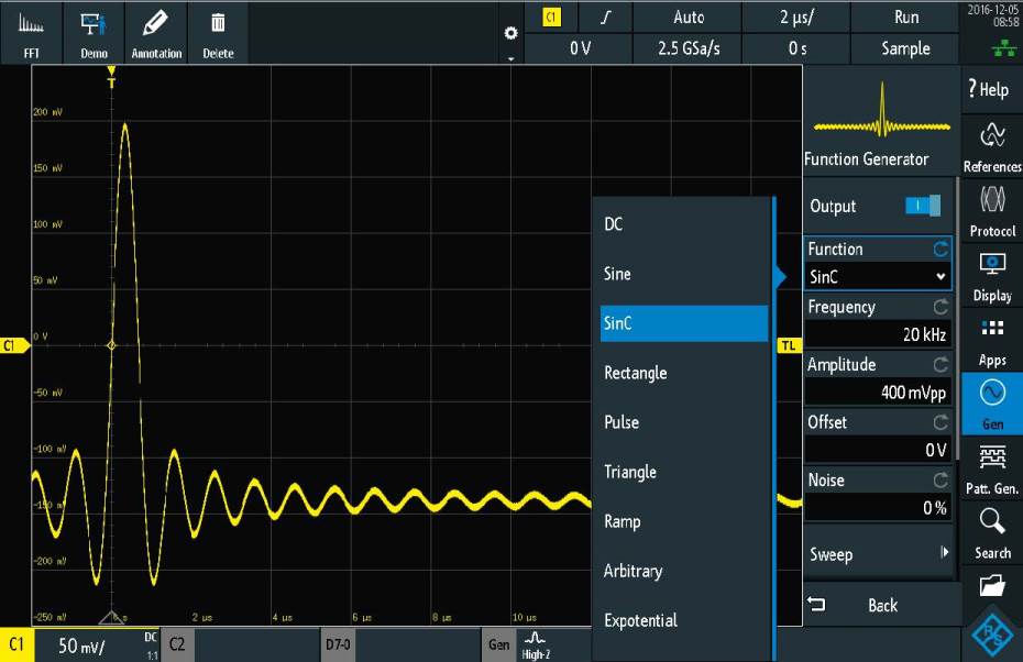 Il flessibile generatore di forme d'onde arbitrario integrato di serie nell'oscilloscopio R&S RTB 2L'aggiunta del generatore di forme d'onda arbitrario consente agli utenti di creare segnali di stimolo per la verifica dei circuiti o di emulare componenti mancanti sulla scheda.