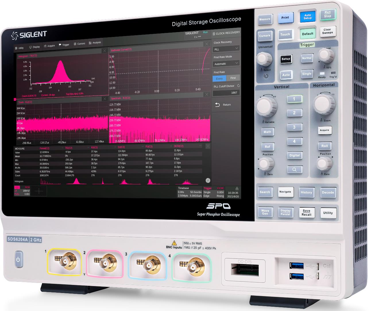L'oscilloscopio Siglent SDS6000A è disponibile con larghezze di banda massima dei canali di 500 MHz, 1 GHz e 2 GHz. La memoria di acquisizione ha una dimensione massima di 500 Mpts ed è distribuita su 1, 2 o 4 canali. La velocità di acquisizione delle forme d'onda può raggiungere fino a 750.000 forme d'onda/s in modalità sequenza.