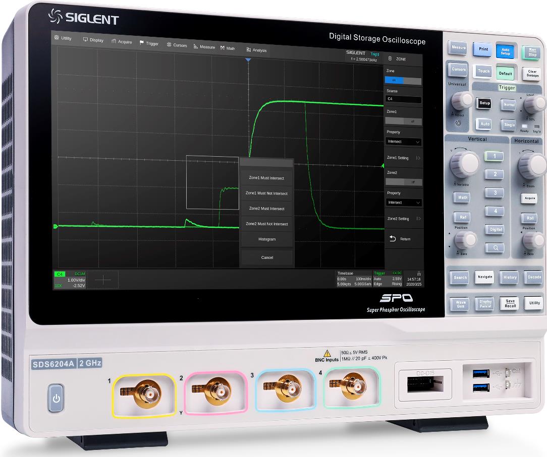 Come per tutti gli oscilloscopi Siglent, la funzione Cronologia, il test con maschera, il diagramma di Bode e un pacchetto di decodificatori di bus seriali (I2C, SPI, UART, CAN, LIN) sono disponibili di serie in questa linea di strumenti.