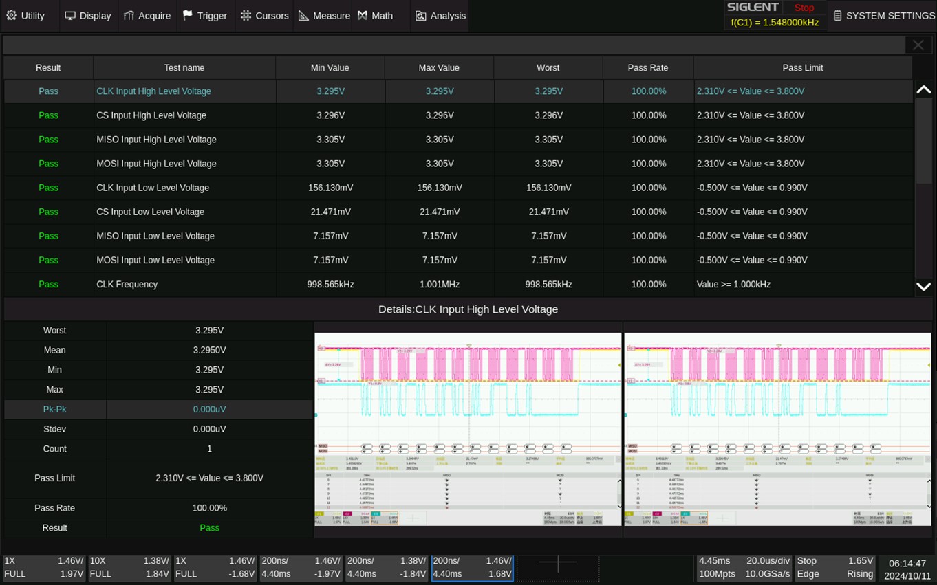 L'oscilloscopio SDS7604A configura automaticamente le impostazioni per ogni test, visualizza risultati dettagliati e genera rapporti in formato HTML o XML completi per una facile documentazione e revisione.
