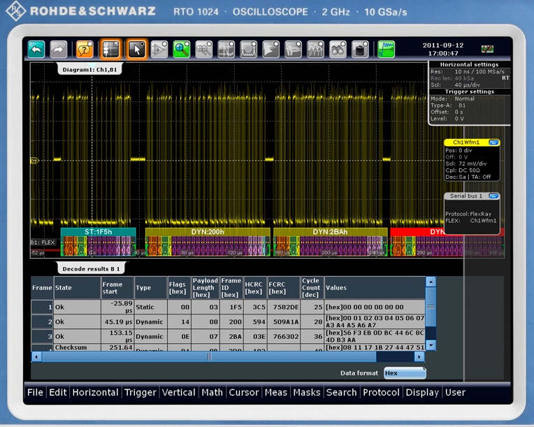 Per facilitarne l'utilizzo con l'oscilloscopio, Rohde & Schwarz ha realizzato l'opzione RTO-K4, che permette di definire il trigger su particolari azioni e stati a livello di protocollo FlexRay, e di effettuarne in chiaro la decodifica in tempo reale.