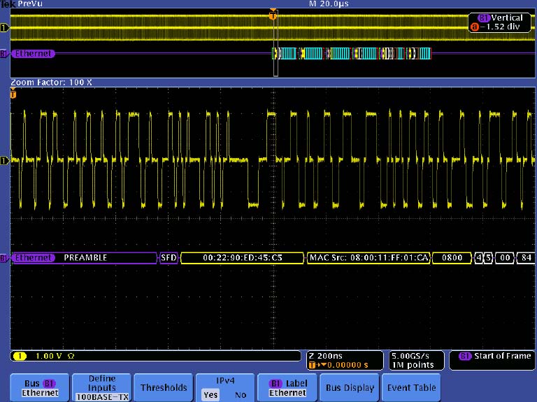 L'opzione per l'analisi dei segnali Ethernet permette di decodificarli ed analizzarli, nonché di impostare il trigger su alcuni parametri fondamentali, come i dati e gli indirizzi MAC dei pacchetti dei protocolli di livello 2, oppure gli indirizzi dei pacchetti dei protocolli di livello 3 TCP e IP.