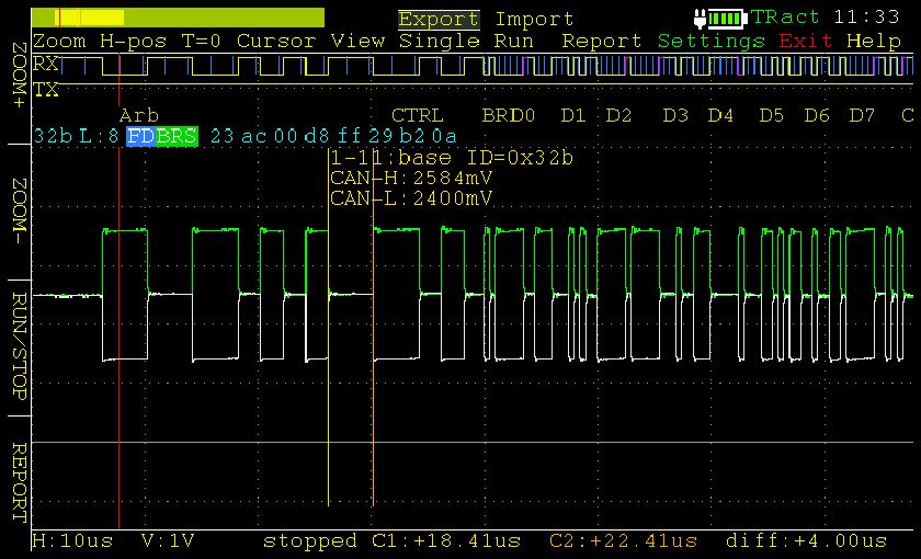 In base all'andamento del segnale, il tester PCAN-Diag FD decodifica i frame CAN e ne mostra gli elementi nella grafica dell'oscilloscopio.