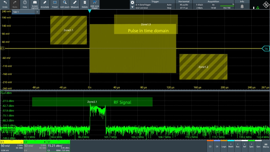 Trigger a zona utilizzato per attivarsi in corrispondenza di una specifica lunghezza di segnale chirp RF nel dominio del tempo e quando il chirp supera un determinato livello di potenza nel dominio della frequenzaInoltre, nel caso degli oscilloscopi MXO di Rohde & Schwarz, le zone di trigger possono essere molteplici e appartenere e più domini: nel dominio nel tempo e nel dominio della frequenza.