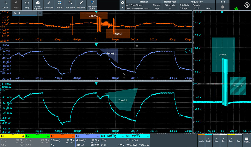 Misure sulla linea di alimentazione con trigger a zona per isolare gli eventi che consumano energia durante le trasmissioni RFSi tratta di una soluzione fino a 10.000 volte più veloce rispetto a quanto è possibile ottenere con i classici sistemi di trigger a zona basati sul software.