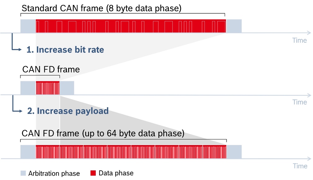 Così facendo, senza allungare il periodo complessivo che caratterizza le trame CAN, si riescono a trasmettere molto di più dati. Inoltre, è stato prevista la possibilità di trasmettere nel campo dati fino a 64 byte anziché 8.