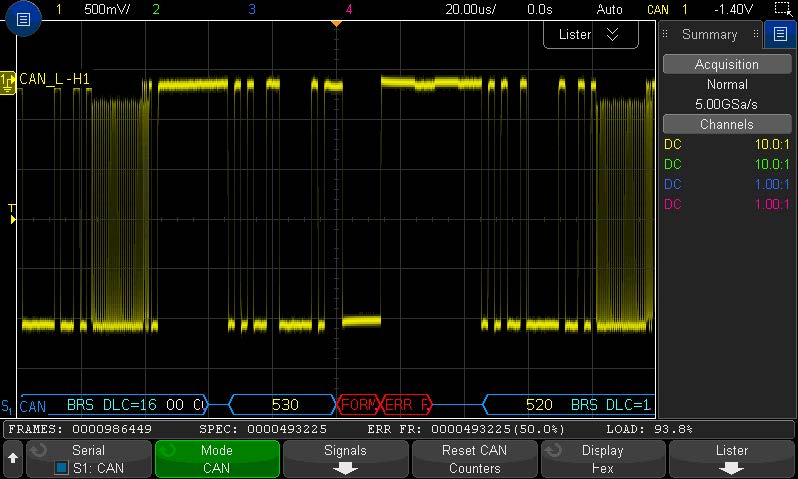 La modifica dinamica al ritmo di trasmissione durante la trama CAN FD rende ancora più scomodo decodificare 'a vista' con l'oscilloscopio il contenuto informativo trasportato dal bus e il rispetto dei requisiti temporali e del formato del protocollo previsti dagli standard.