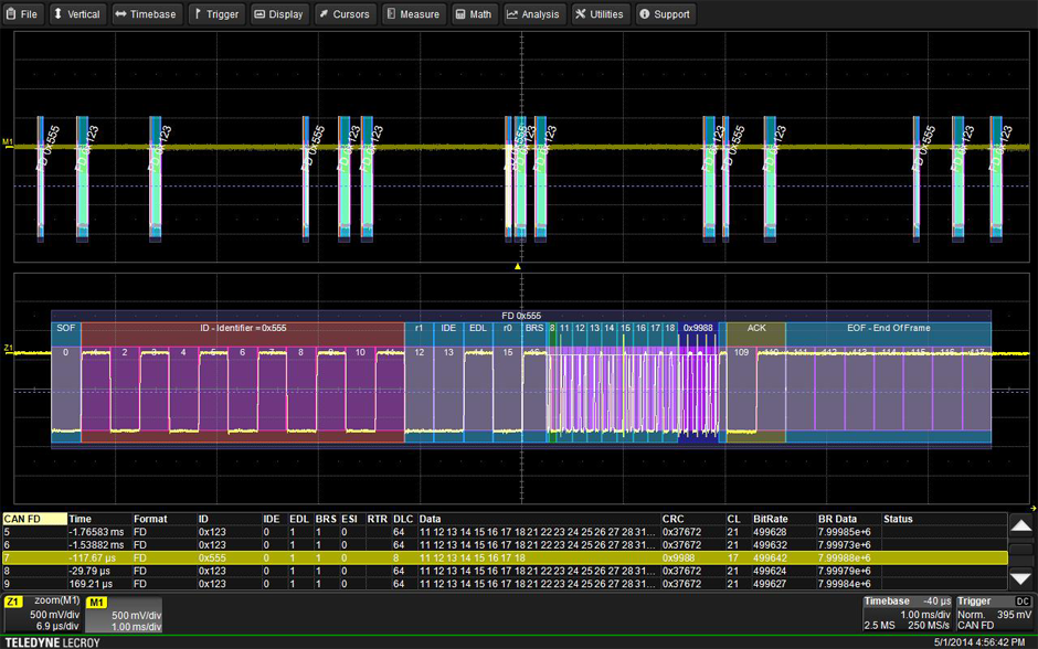 La soluzione per il trigger e la decodifica del bus CAN FD proposta da Teledyne LeCroy (CAN FD TDM) per i suoi oscilloscopi abbina anche le funzioni di misura e rappresentazione grafica che permettono di correlare il comportamento del segnale fisico con l'informazione di protocollo e di misurare contemporaneamente la prestazioni del bus riportando i risultati sotto forma di grafici.