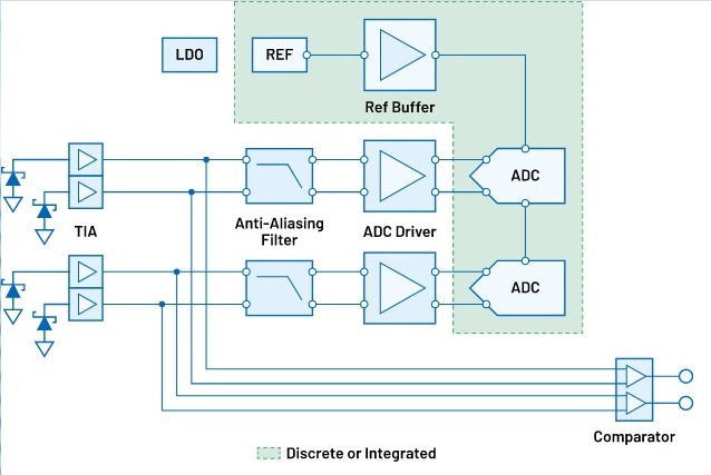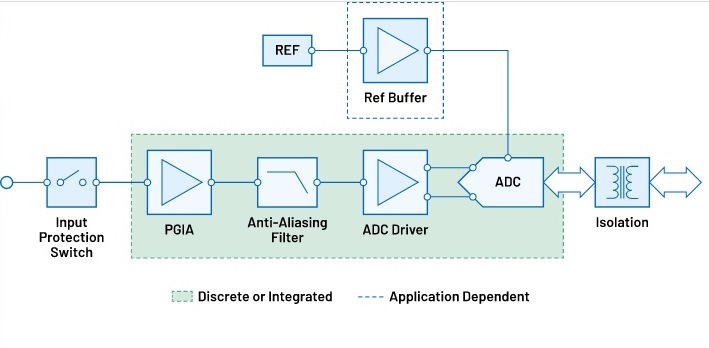 Le catene di segnale di precisione a media larghezza di banda combinano amplificatori di precisione, riferimenti di tensione, convertitori analogico-digitali (ADC), convertitori digitale-analogico (DAC), protezione dei circuiti e componenti per l'isolamento.