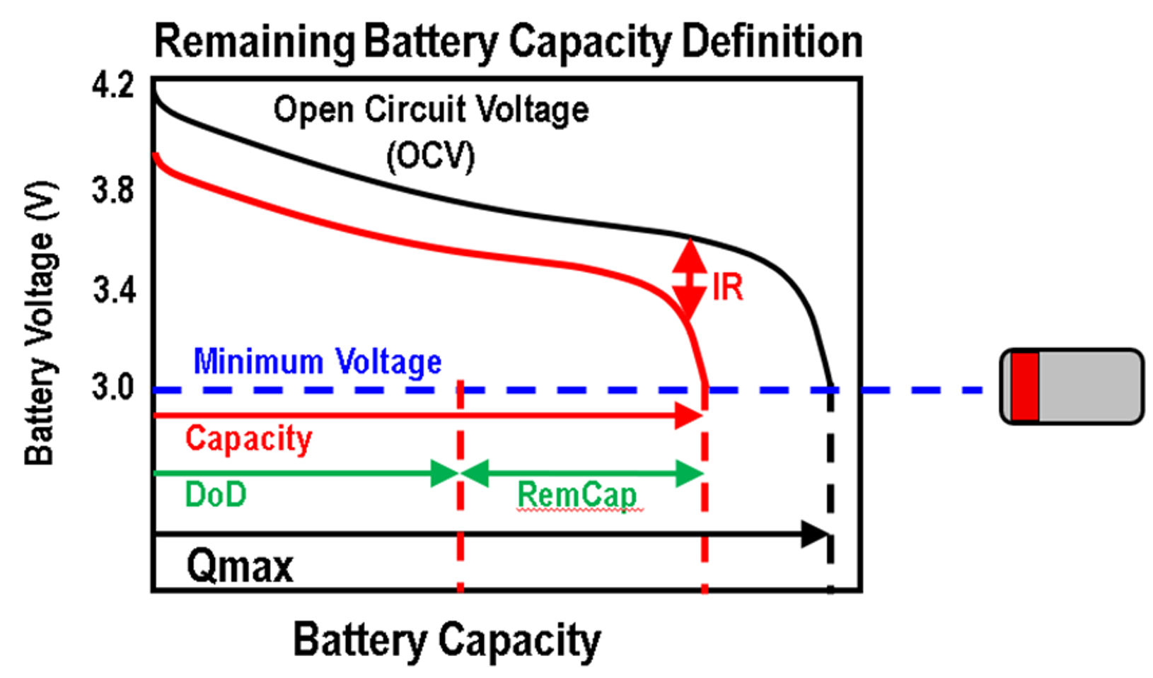 La previsione della capacità residua dipende fortemente dalla corrente di carico e dalla resistenza. La caduta di tensione IR attraverso la resistenza interna della batteria rende la quantità di carica che può essere fornita dalla batteria una funzione della corrente di carico. Per correnti maggiori, la tensione ai terminali della batteria raggiunge prima il valore minimo.