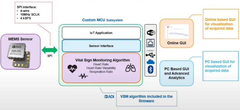 La dimostrazione in fiere ha permesso illustrare le potenzialità del nuovo sistema che Analog Devices sta sviluppando, per il quale si prevede l'immimente approvazione come dispositivo medico da parte dell'agenzia americana FDA, che utilizza i dati dell'accelerometro ADXL355 per dedurre tre segni vitali di un soggetto che dorme: frequenza cardiaca, variabilità della frequenza cardiaca e frequenza respiratoria.
