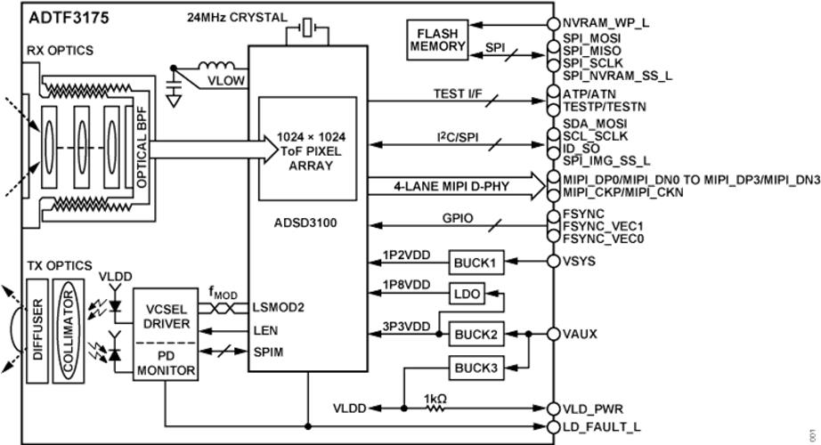 Schema a blocchi del modulo ADTF3175Il modulo integra il sensore CMOS da 1 megapixel ADSD3100 basato sul tempo di volo, l'obiettivo e il filtro ottico passa-banda necessario per realizzare i sistemi di visione, una sorgente di illuminazione a infrarossi completa di ottiche, diodo laser e relativo driver, il fotorilevatore, una memoria flash e i regolatori di potenza per generare le tensioni di alimentazione necessarie.