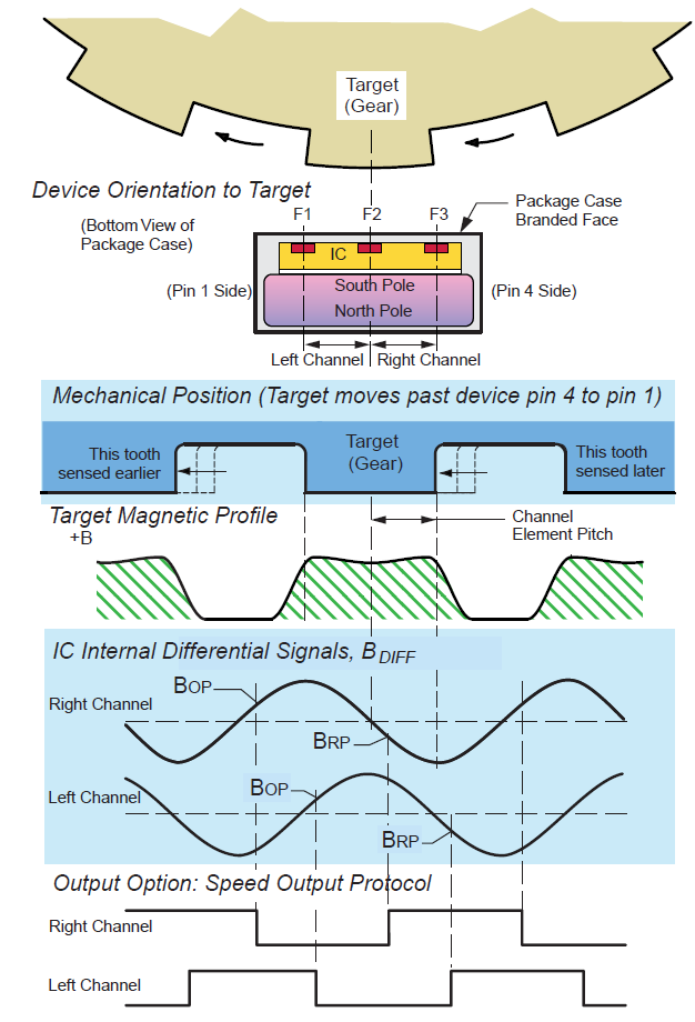 Il sensore contiene degli elementi magnetici a terre rare che consentono per effetto Hall di rilevare la variazioni di posizione di elementi ferrosi, quali denti di ingranaggi, ruote dentate o altri elementi sporgenti, da cui è possibile risalire alla velocità e al verso di rotazione del motore.