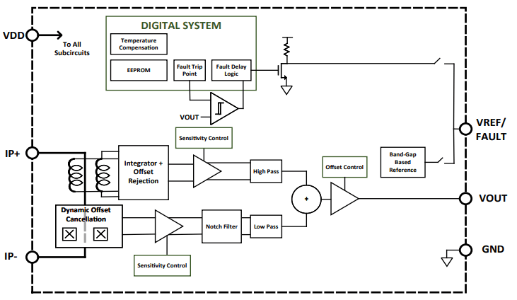 Schema a blocchi del sensore di corrente integrato a banda larga ACS37030 con due percorsi di misura interni, a bassa e alta frequenzaQuesti sensori utilizzano un sistema a doppio percorso di segnale, con un percorso che misura la componente continua e a bassa frequenza della corrente utilizzando elementi a effetto Hall, mentre l’altro misura le componenti ad alta frequenza della corrente attraverso una bobina induttiva.