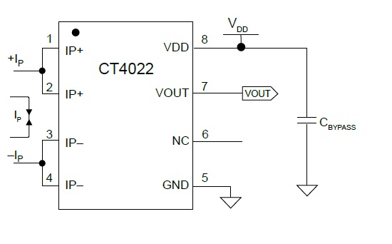 Circuito applicativo del sensore di corrente CT4022: la tensione VOUT varia linearmente con la corrente primaria IPLa resistenza del conduttore primario di entrambi i modelli è di 1 mΩ, il che consente al sensore di sopportare correnti di spunto elevate e ridurre al minimo la perdita di potenza. La corrente applicata al pin del conduttore primario genera un campo magnetico differenziale interno. Il sensore TMR fornisce una tensione proporzionale al campo magnetico differenziale, eliminando praticamrente gli effetti dei campi magnetici vaganti o parassiti di modo comune.