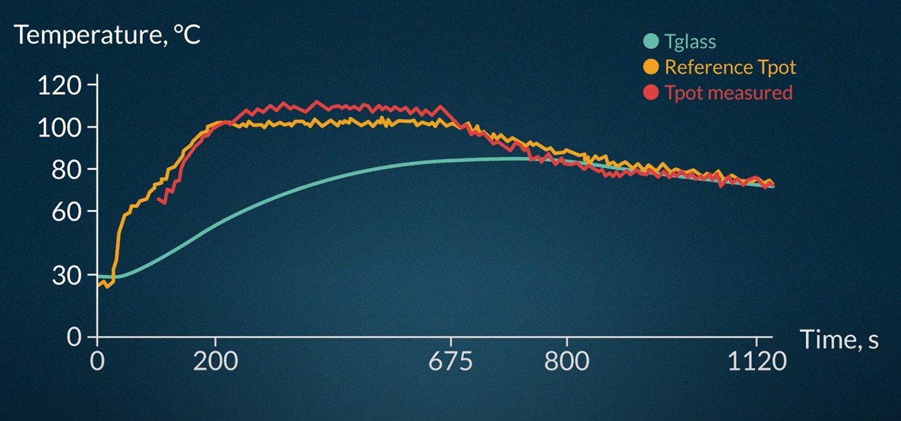 Rispetto a un piano cottura a induzione standard che misura la temperatura del piano in vetroceramica (Tglass), tramite un filtraggio ottico avanzato, il sensore MLX90617 guarda attraverso il vetro per fornire un risultato in tempo reale della temperatura alla base del recipiente di cottura (Tpot misurata). Confrontando i risultati, emerge che la misura fornita dal sensore MLX90617 è significativamente più vicina alla temperatura effettiva delle pentole e delle padelle (Tpot misurata).