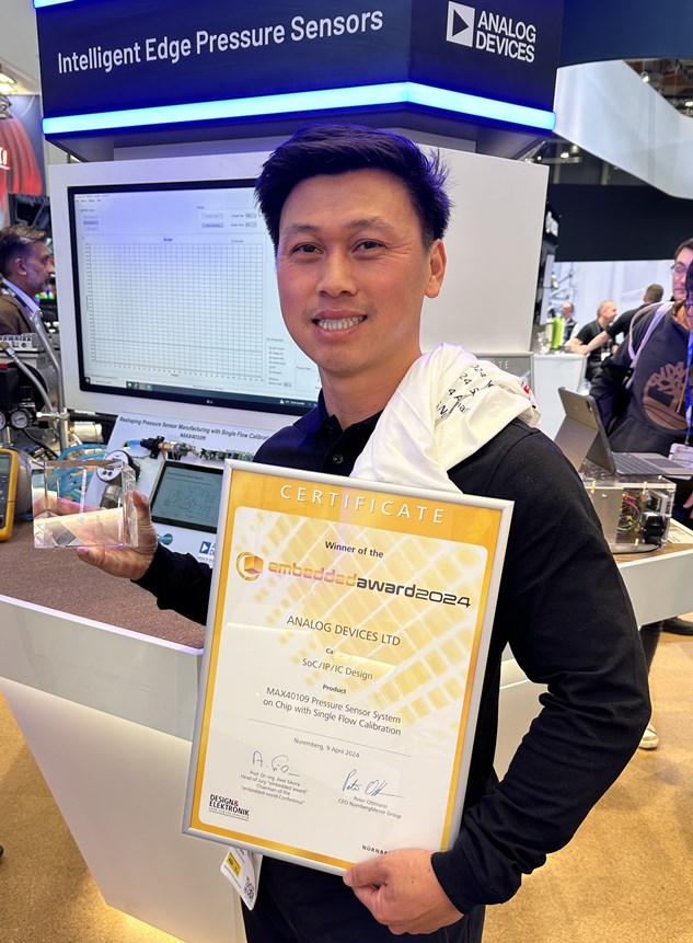 Kien Mach con il premio "embedded award 2024" assegnato al chip MAX40109Nel chip è inoltre integrato con un motore DSP per il calcolo di polinomi di terzo ordine, un blocco funzionale fondamentale per generare il segnale di uscita calibrato, eliminando la necessità di un processore aggiuntivo.