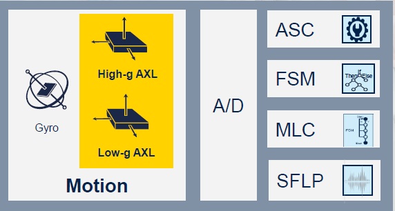 L'IMU LSM6DSV320X contiene due accelerometri (per alto e basso g), un giroscopio, una macchina a stati finiti (FSM) e un nucleo di inferenza AI (MLC)