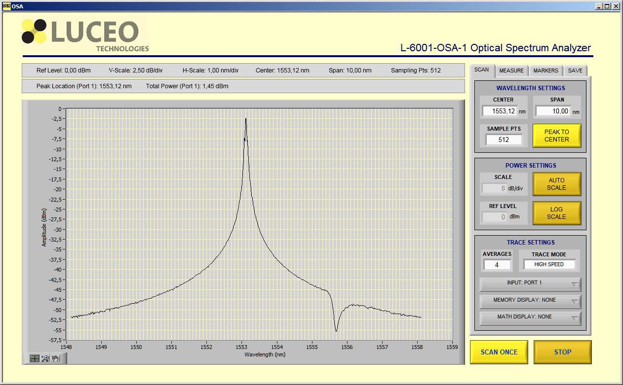 L'analizzatore di spettro ottico L-6001-OSA offre una risoluzione spettrale FWHM (Full Width Half Maximum) di 200 pm per le versioni modulari e 28 pm per quella da banco. L'accuratezza assoluta è di ±75 pm per i moduli e ±25 pm per lo standalone.