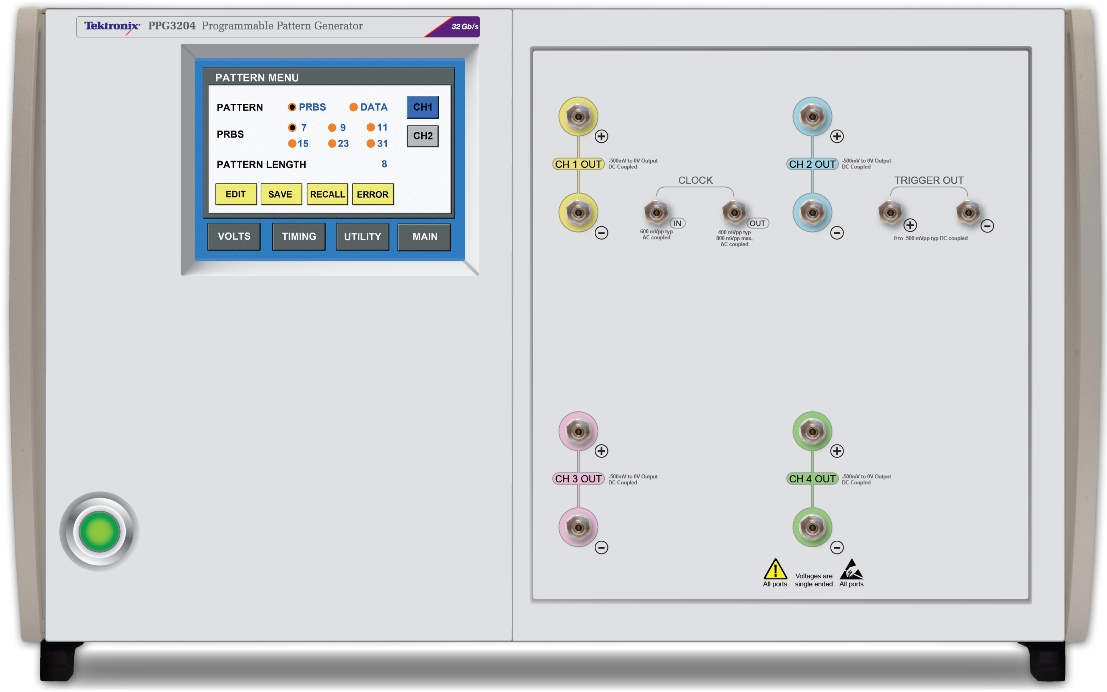 I vari modelli degli strumenti Tektronix PPG3000 comprendono versioni a uno, due e quattro uscita fino a 30 Gb/s o 32 Gb/s con fase di uscita regolabile e pattern pseudocasuali (PRBS) o definiti dall'utilizzatore.
