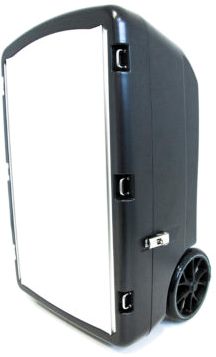 Il banco di lavoro richiuso è praticamente un trolley tipo bagaglio a mano in fibra di carbonio che si trasporta agevolmente ovunque.