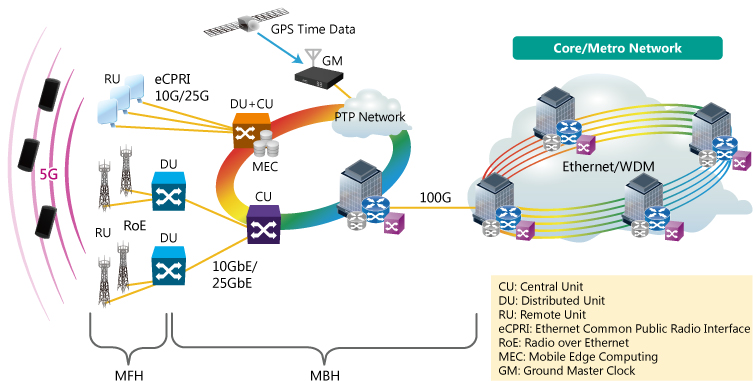 Tuttavia, poiché Ethernet è una tecnologia best-effort, i tempi di latenza della rete richiedono una gestione molto rigorosa. Inoltre, una rete 5G richiede molte più stazioni base, perché si prevede verranno utilizzate bande di frequenza molto elevate, come quelle delle onde millimetriche, che non si propagano facilmente su su lunghe distanze. Le numerose stazioni base andranno tutte accuratamente sincronizzate usando metodologie basate sul protocollo di temporizzazione PTP.