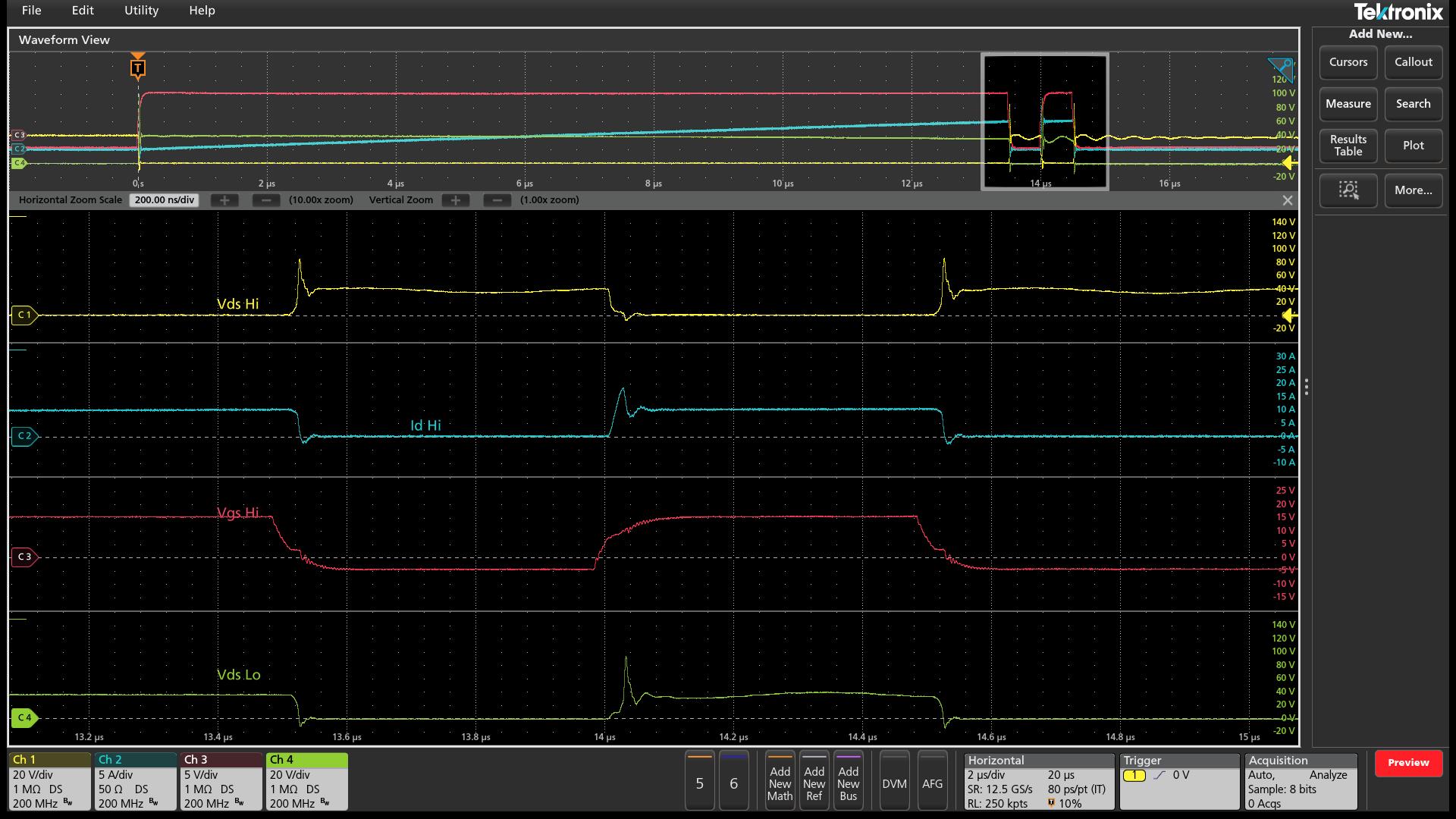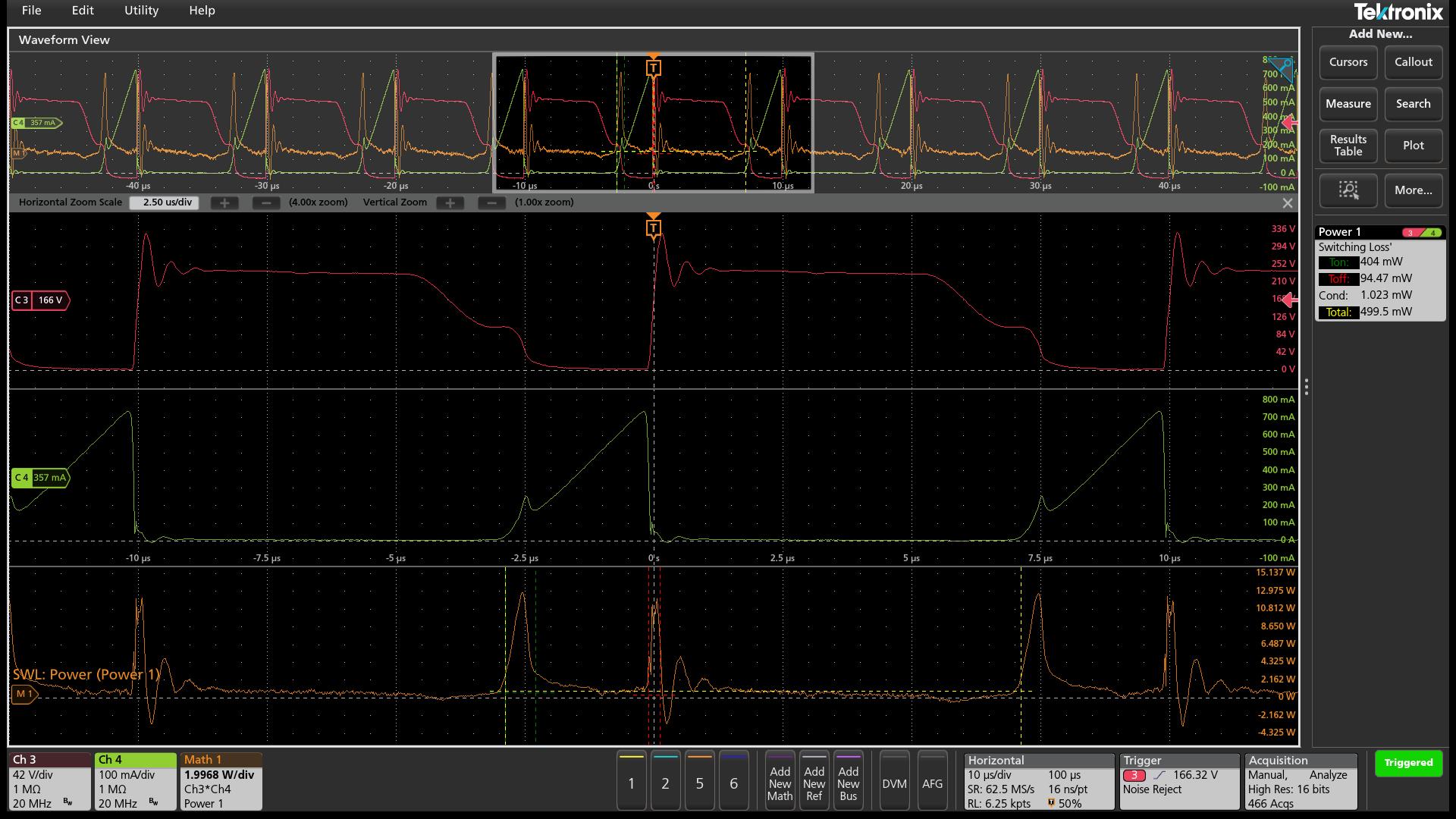 Il software Power Measurement and Analysis esegue automaticamente i calcoli per misurare la perdita di commutazione nei convertitori di potenza. La traccia rossa è la tensione VDS, quella verde è la corrente ID. Il software calcola la traccia arancione che mostra la perdita di potenza durante la commutazione.L'opzione Advanced Power Measurement and Analysis (4-PWR) è un esempio di tale pacchetto. Il software automatizza il processo di configurazione delle principali misure di potenza per la verifica degli ingressi dalle rete in AC, come frequenza, tensione e corrente RMS, fattore di cresta (tensione e corrente), potenza reale, reattiva e apparente, fattore di potenza e fase.