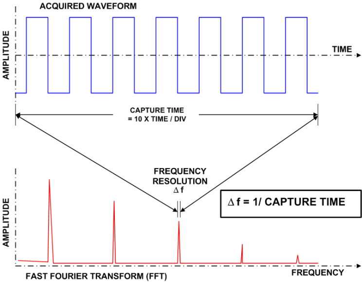 Δf è determinato dalla durata nel tempo del segnale acquisito dall’oscilloscopio e passato come input dell’algoritmo di calcolo della FFT. Se la sorgente è un canale di acquisizione (ad esempio un canale di acquisizione di un oscilloscopio) la durata nel tempo della forma d’onda acquisita in prtaica è data dal tempo di cattura che è fissato a 10 volte il valore del controllo TIME/DIV.