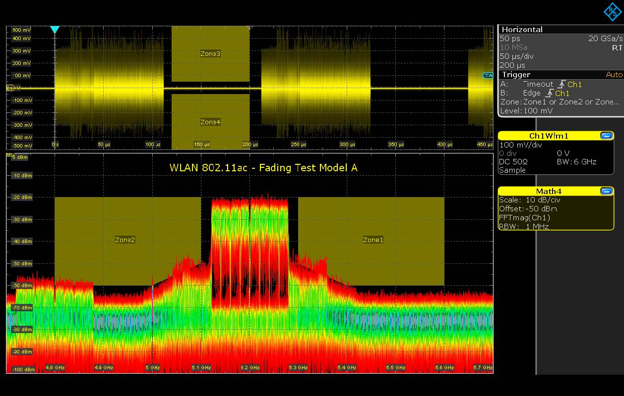 L’intrinseca maggior flessibilità degli oscilloscopi rispetto agli analizzatori di spettro permette acquisizioni di segnale multiple in aggiunta a quella dei puri segnali RF. È quindi possibile correlare il segnale RF ad altri segnali, ad esempio il rail di alimentazione, segnali su bus digitali, segnali di controllo, ecc. dato che l’allineamento temporale fra tutti questi segnali è sempre assicurato dall’oscilloscopio.