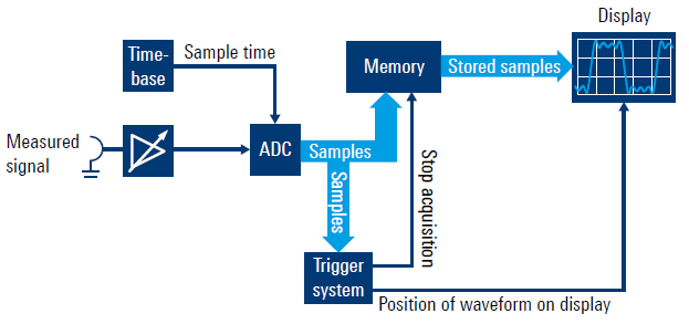 Sistema di trigger digitale degli oscilloscopi Rohde & SchwarzNegli strumenti di fascia alta il trigger è gestito in modalità completamente digitale sui campioni digitalizzati dall’ ADC (non esiste canale di trigger analogico) con ulteriore vantaggio di maggior flessibilità di trigger e minor sensibilità al jitter del trigger.