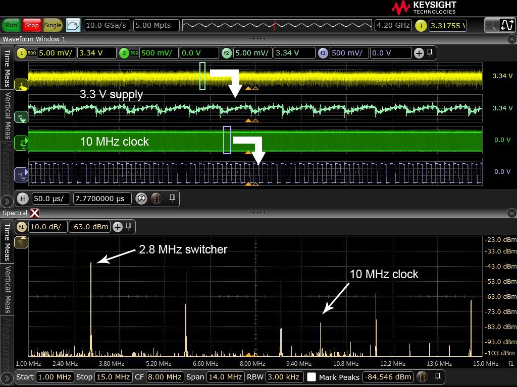 In questo esempio consideriamo un convertitore DC-DC switching che converte la tensione di alimentazione da 5 V a 3,3V. Il convertitore funziona a 2,8 MHz. Altrove nel circuito vi sono altri componenti alimentati a 5 V che lavorando con un segnale di clock a 10 MHz.