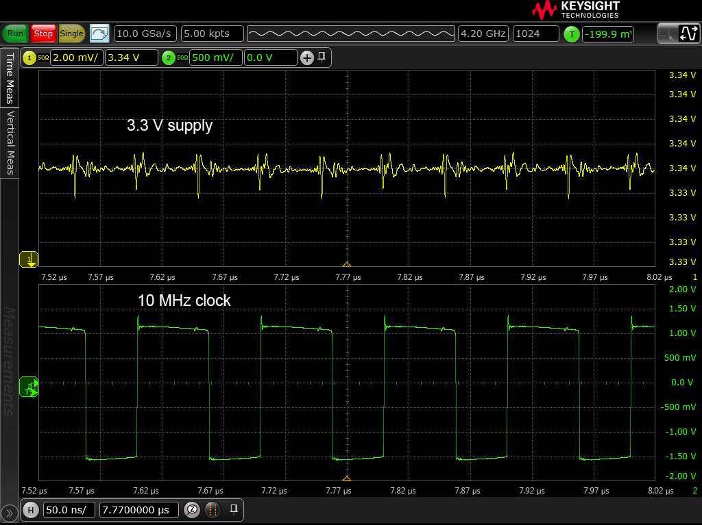 Per dimostrare questo approccio misuriamo contemporaneamente l’alimentazione a 3,3 V ed il segnale a 10 MHz. Poi impostiamo il trigger dell’oscilloscopio sul fronte di salita del segnale di clock. Infine impostiamo la modalità di acquisizione dell’oscilloscopio sulla media analogica.