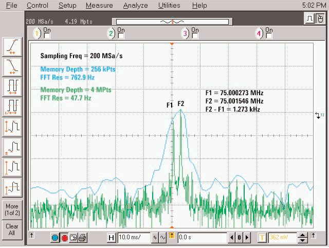 Ad esempio, se l’alimentatore switching funziona a 33 kHz, è necessario campionare 1/(33 kHz) o 30 microsecondi per vederlo. Con una frequenza di campionamento di 20 GSa/s, sono necessari 600.000 campioni in memoria. Normalmente la FFT viene calcolata solamente sui campioni visualizzati sul display.