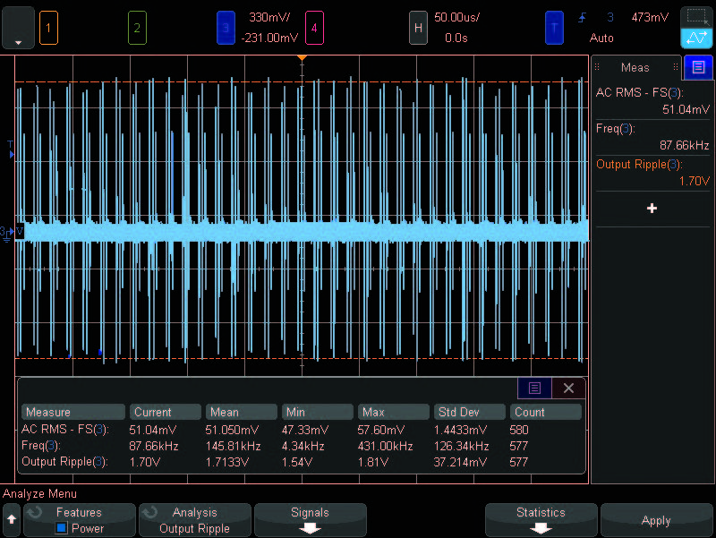 La funzione FFT di un oscilloscopio può essere impiegata per restringere il campo di indagine. L’uso del trigger e delle medie può aiutare a verificare l’entità dell’impatto di queste sorgenti sul rumore totale dell’alimentazione.
