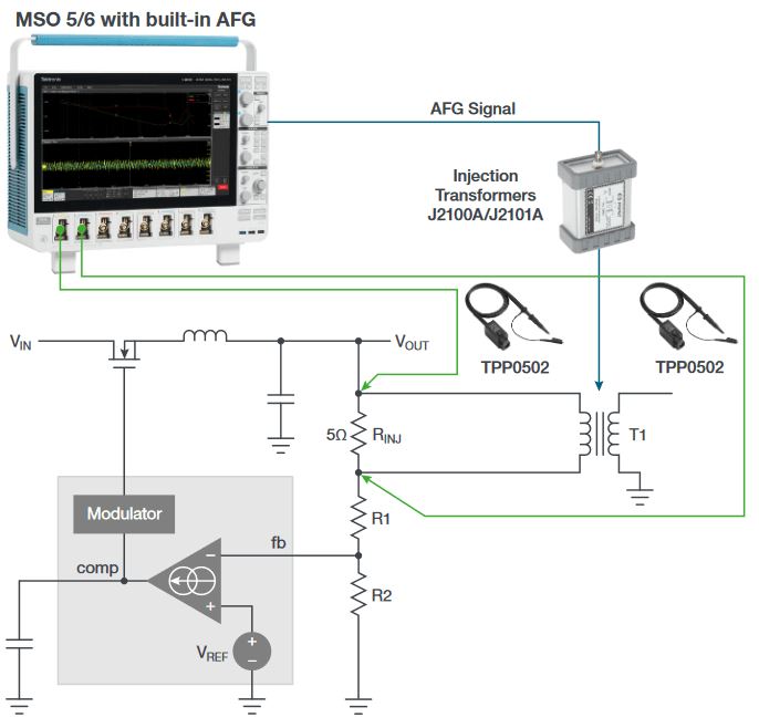 Diversi oscilloscopi Tektronix offrono sorgenti di segnale integrate che possono essere utilizzate per iniettare un segnale nella retroazione dell'anello attraverso un trasformatore di isolamento.