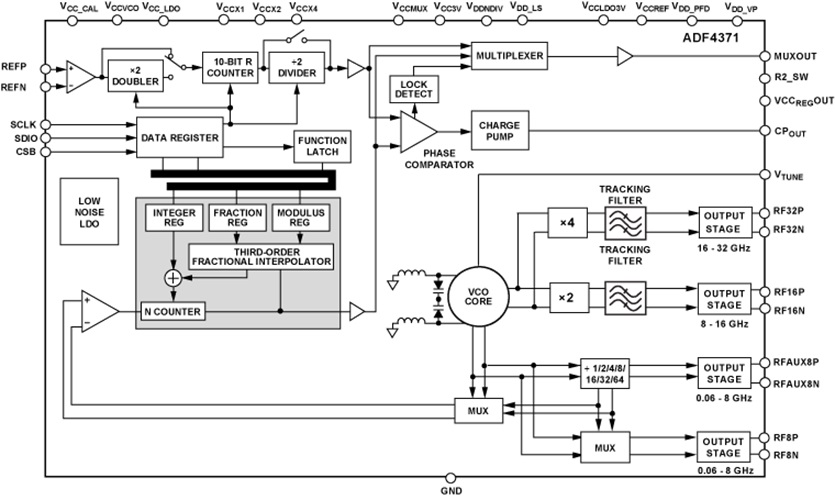 Ad esempio, utilizzando un filtro di anello e un segnale di riferimento esterni, il generatore ADF4371 facilita la realizzazione di sintetizzatori di frequenza PLL N-frazionari o N-interi ad alta risoluzione (39-bit). La struttura a larga banda del VCO permette la generazione di frequenze nel campo da 62,5 MHz a 32 GHz.